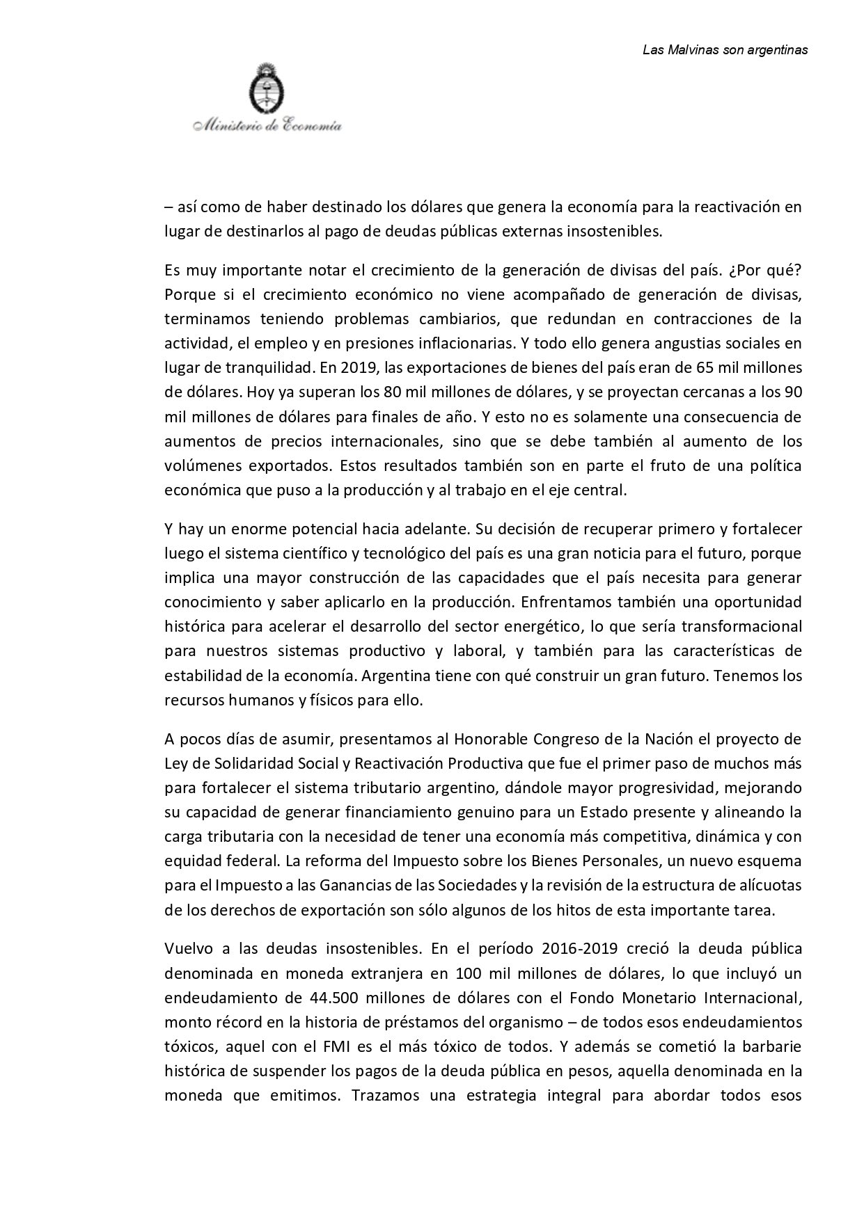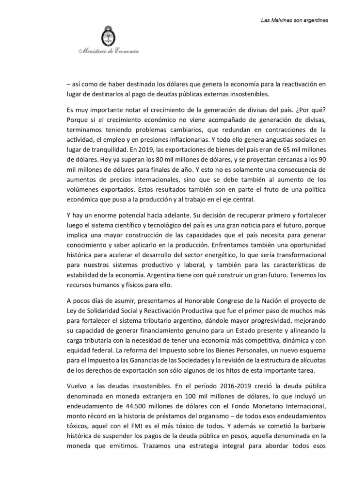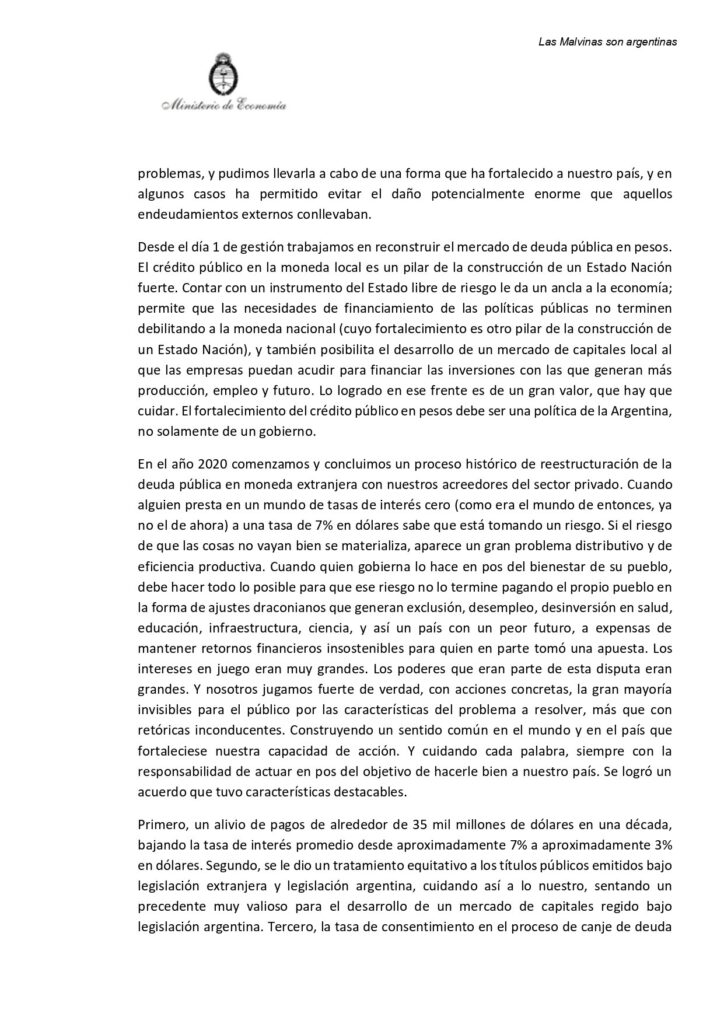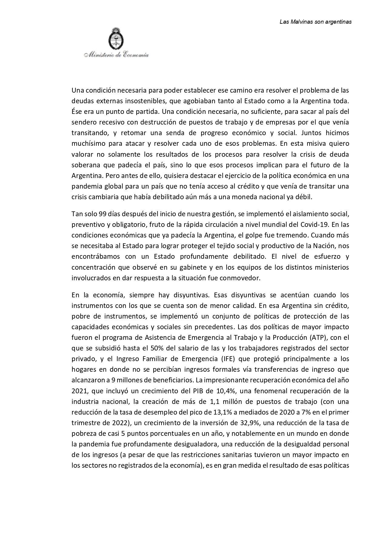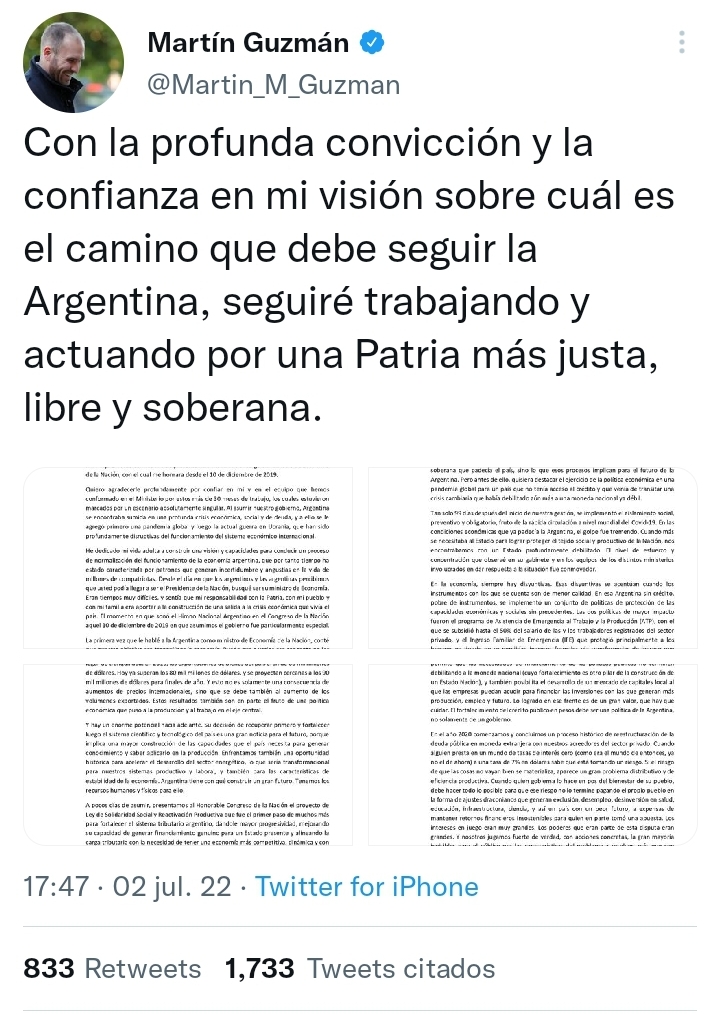 Guzmán renunció a través de una extensa carta dirigida al Presidente, que publicó en Twitter. “Con la profunda convicción y la confianza en mi visión sobre cuál es el camino que debe seguir la Argentina, seguiré trabajando y actuando por una Patria más justa, libre y soberana”, dijo en la misiva, en los que destacó sus logros de gestión.