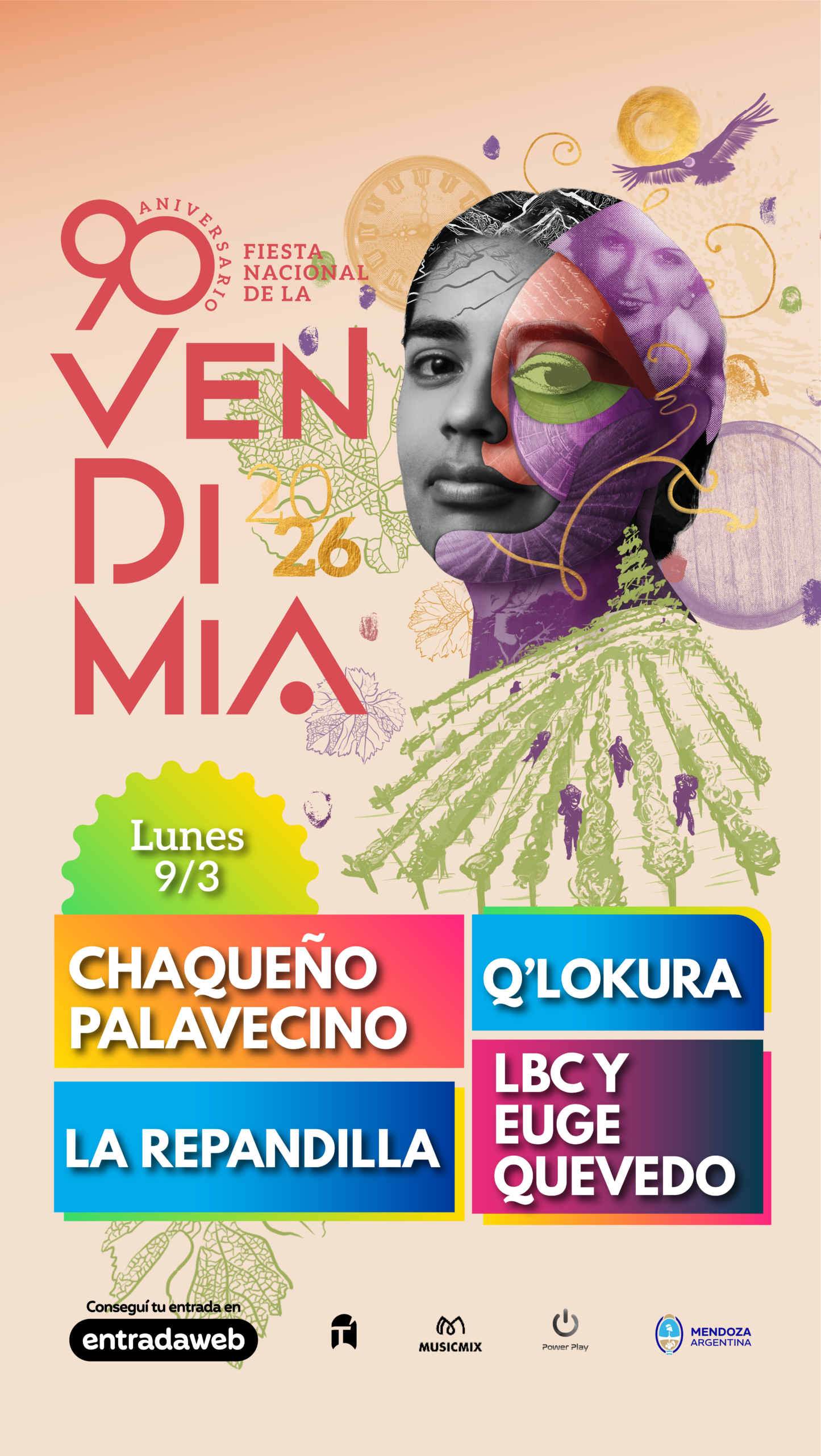 Para el lunes 9 de marzo no habrá repetición del Acto Central, pero será una noche dedicada a la música popular y cumbia. El escenario recibirá a la voz del cuarteto Eugenia Quevedo junto a La Banda de Carlitos; la cumbia de La Repandilla y el cierre de QLokura. El proyecto de cuarteto más escuchado del país y uno de los fenómenos más federales de la música argentina actual será parte de la celebración emblemática de Mendoza. Además, el Chaqueño Palavecino iniciará el encuentro a puro folclore y alegría. La raíz y celebración popular convivirán en una misma noche.