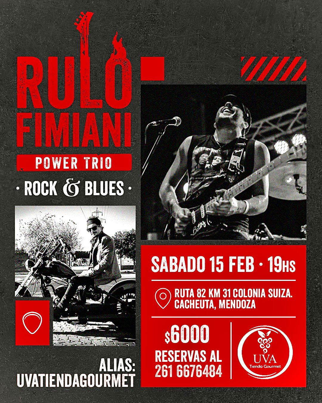 El reconocido guitarrista de Rock y Blues, Rulo Fimiani tocará (rulofimiani) junto a su banda Power Trío estará brindando un concierto íntimo e interactivo en Uva Tienda Gourmet. Un entorno natural ideal para disfrutar en vivo las canciones de Rulo Fimiani y clásicos del Rock y Blues como Eric Clapton, Jimi Hendrix, BB King, Pappo y Manal, entre otros.
