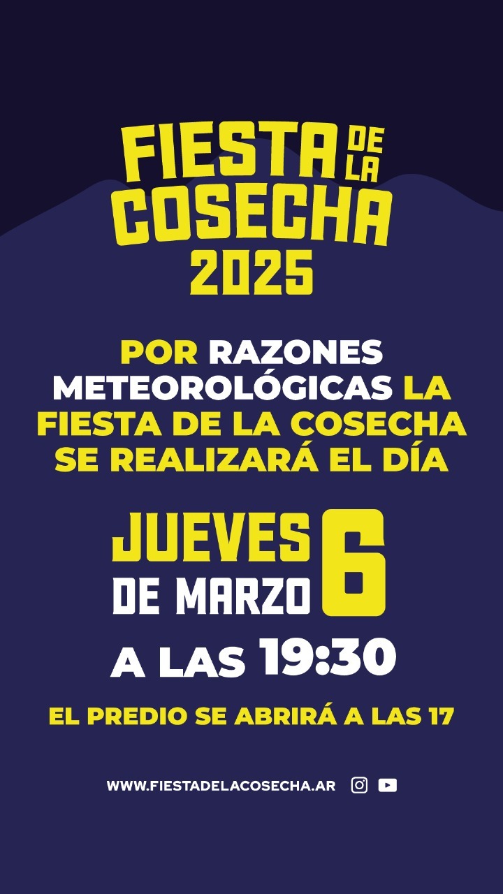 Desde la organización de la Fiesta de la Cosecha 2025 (fiestadelacosecha) se informa que porrazones climáticas el evento se reprograma para el jueves 6/3, en el viñedo del Aeropuerto Internacional.