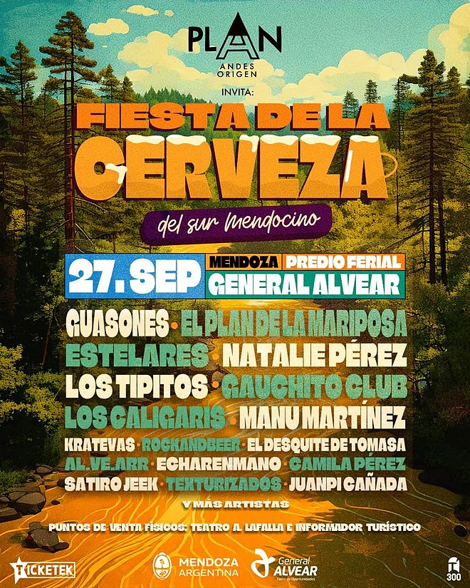 Con la participación de grandes artistas y diversidad de estilos, organizado por la Municipalidad de Gral. Alvear (munialvear) con el apoyo de 300 Producciones (300producciones), el sábado 27 de septiembre, desde las 14 h, se realizará la 1ra edición de la Fiesta de la Cerveza en el Sur mendocino, en el Predio Ferial de General Alvear (Ruta 188 y Calle 7).
