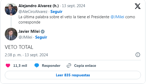 «Veto total», escribió en mayúsculas en su cuenta de X el presidente Javier Milei sobre la ley de financiamiento universitario. Lo hizo como respuesta a un posteo del Subsecretario de Políticas Universitarias de la Nación, Alejandro Álvarez, que escribió: «La última palabra sobre el veto la tiene el Presidente Javier Milei, como corresponde». Luego reposteó al economista Felipe Nuñez que lanzó: «El equilibrio fiscal es innegociable».