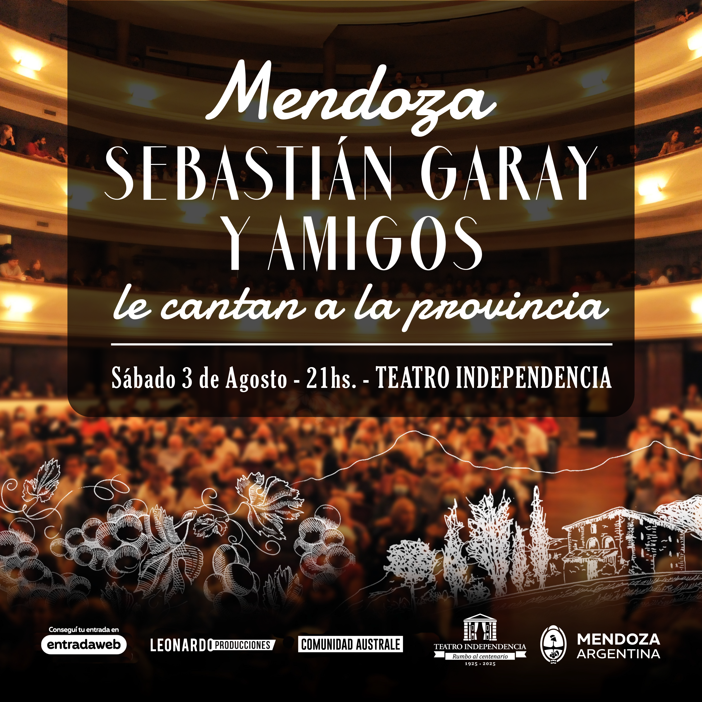 “Mendoza. Sebastián Garay y Amigos le canta a la provincia”, ofrecerá una única presentación, el sábado 3 de agosto, a las 21 horas, en el Teatro Independencia. Las entradas anticipadas están disponibles en Entradaweb.com.ar.