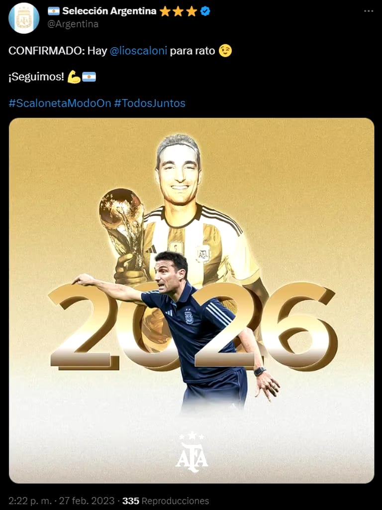 “CONFIRMADO: Hay Lionel Scaloni para rato. ¡Seguinos! #ScalonetaModoOn #TodosJuntos”. Con ese mensaje en la cuenta de Twitter de la selección argentina, la AFA anunció la extensión del contrato del entrenador hasta la Copa del Mundo de Estados Unidos, México y Canadá 2026. Así, le puso punto final a la novela de la renovación, que luego de la conquista en Qatar se había demorado por algunas diferencias que habían surgido, en cuanto a lo económico y a aspectos organizativos.