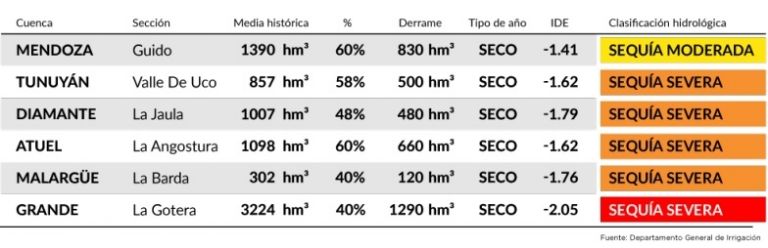 El derrame de esta temporada en el río Mendoza será de 830hm³, de esa cantidad 250hm3 anuales son usados para agua potable (el cual tiene prioridad sobre otros usos), para la distribución a los otros usos quedarán 580hm3 en el Río Mendoza. Por ello, pasará a tener un promedio de sequía extrema.