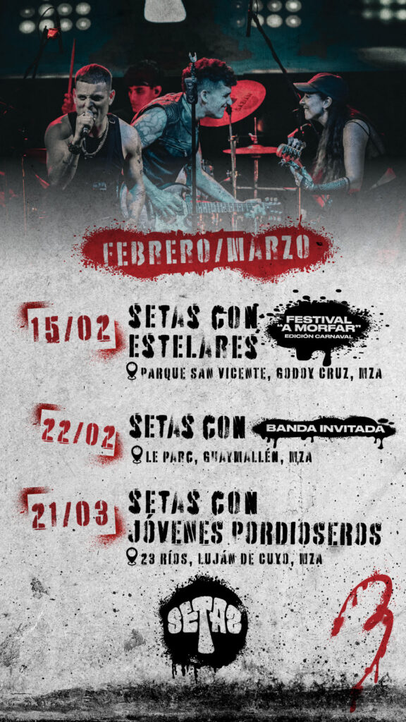 Durante el último año, Setas (setas.banda) participó en algunos de los escenarios más importantes de la provincia, como la Fiesta de la Cerveza, la Fiesta de San Patricio y La Mansa Primavera en Godoy Cruz. Además, la banda llevó su música a otras provincias, ampliando su recorrido y su público.