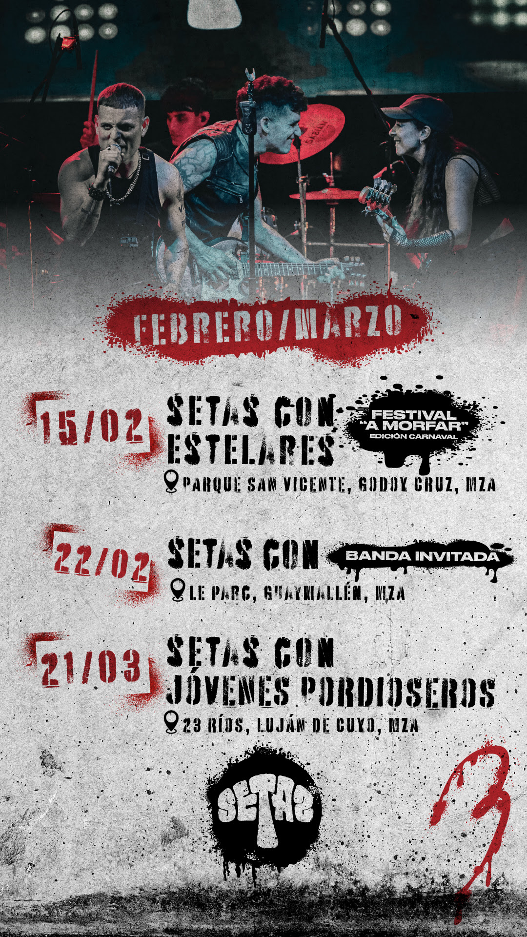 El 2026 llega cargado de fechas y nuevos desafíos. Setas continúa consolidando su lugar dentro de la nueva escena del rock argentino, compartiendo escenario con algunas de las bandas más importantes del país. El año comenzó con una presentación en Tupungato y una agenda intensa para los próximos meses.