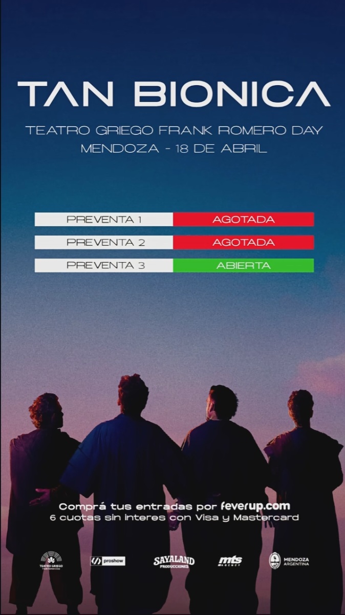 En lo que promete ser uno de los eventos musicales del año, Tan Biónica (tanbionica) vuelve a Mendoza y se presentará el sábado 18 de abril a las 22 horas en el Teatro Griego Frank Romero Day. Con las preventas 1 y 2 ya agotadas y la preventa 3 en su tramo final, la expectativa del público continúa en alza de cara al show que marcará el regreso de la banda a la provincia, en el marco de la presentación de su nuevo álbum “El Regreso”.