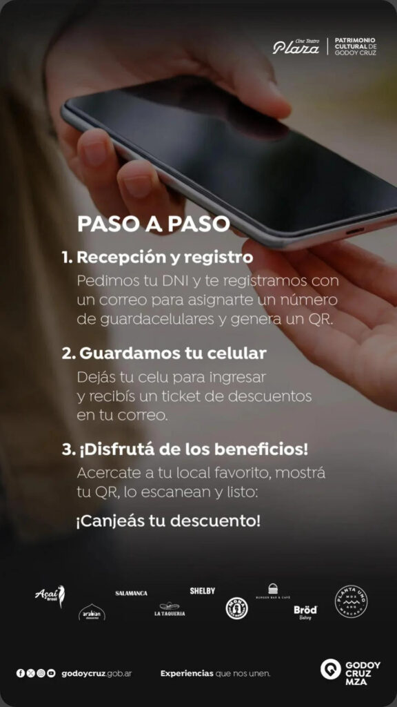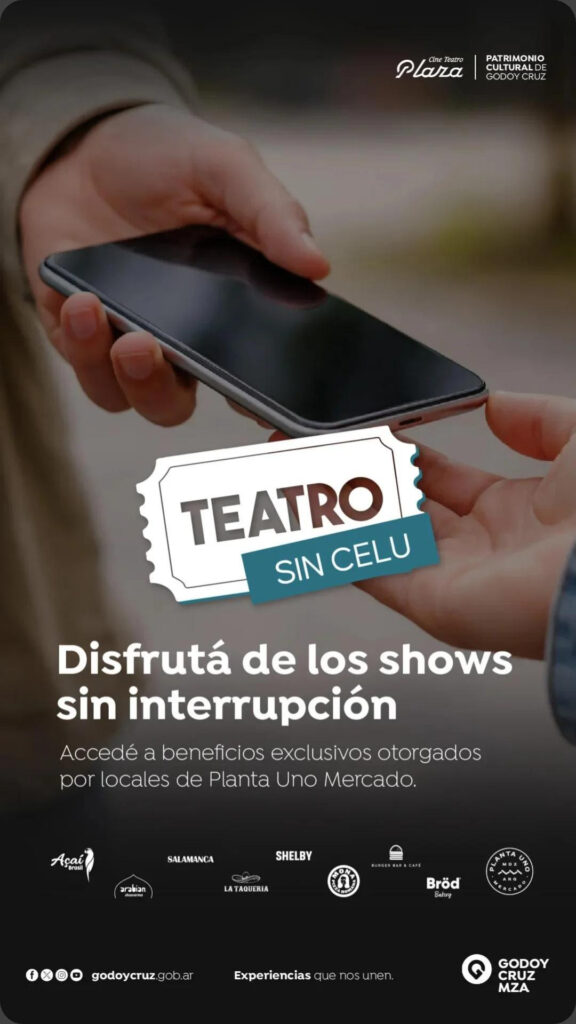 La Municipalidad de Godoy Cruz, a través de la Dirección de Cultura (godoycruz.mza); y Planta Uno Mercado (plantaunomercado), lanzan “Teatro Sin Celu”, un programa de beneficios para quienes asistan al Teatro Plaza y no utilicen su teléfono personal.