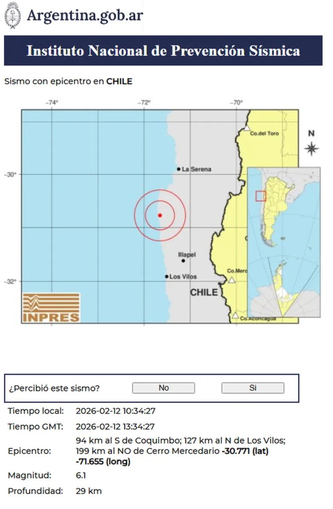 En tanto, el Instituto Nacional de Prevención Sísmica (INPRES) ratificó las novedades que llegaban desde Chile al informar la intensidad de 6.1, que hizo mover a buena parte de Mendoza.