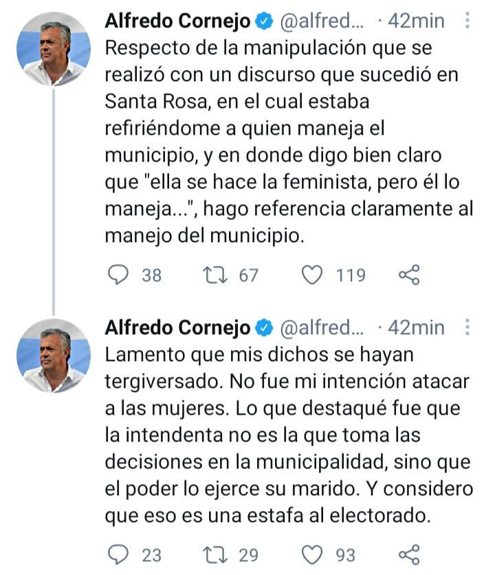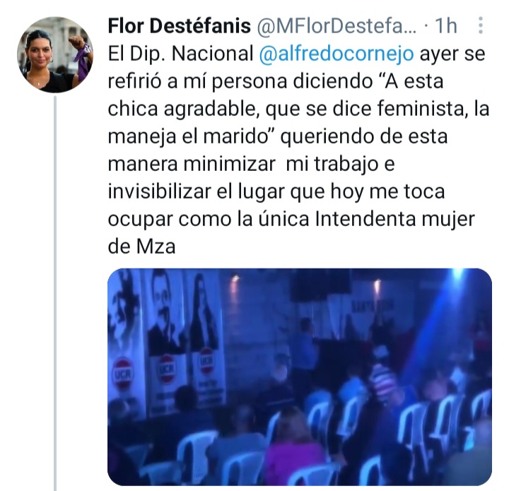 Para defenderse de este hecho Alfredo Cornejo twitteó también diciendo que sus dichos se habían trasgiversado y que se referia a la intendente del lugar donde se encontraban y no a Flor Destéfanis.