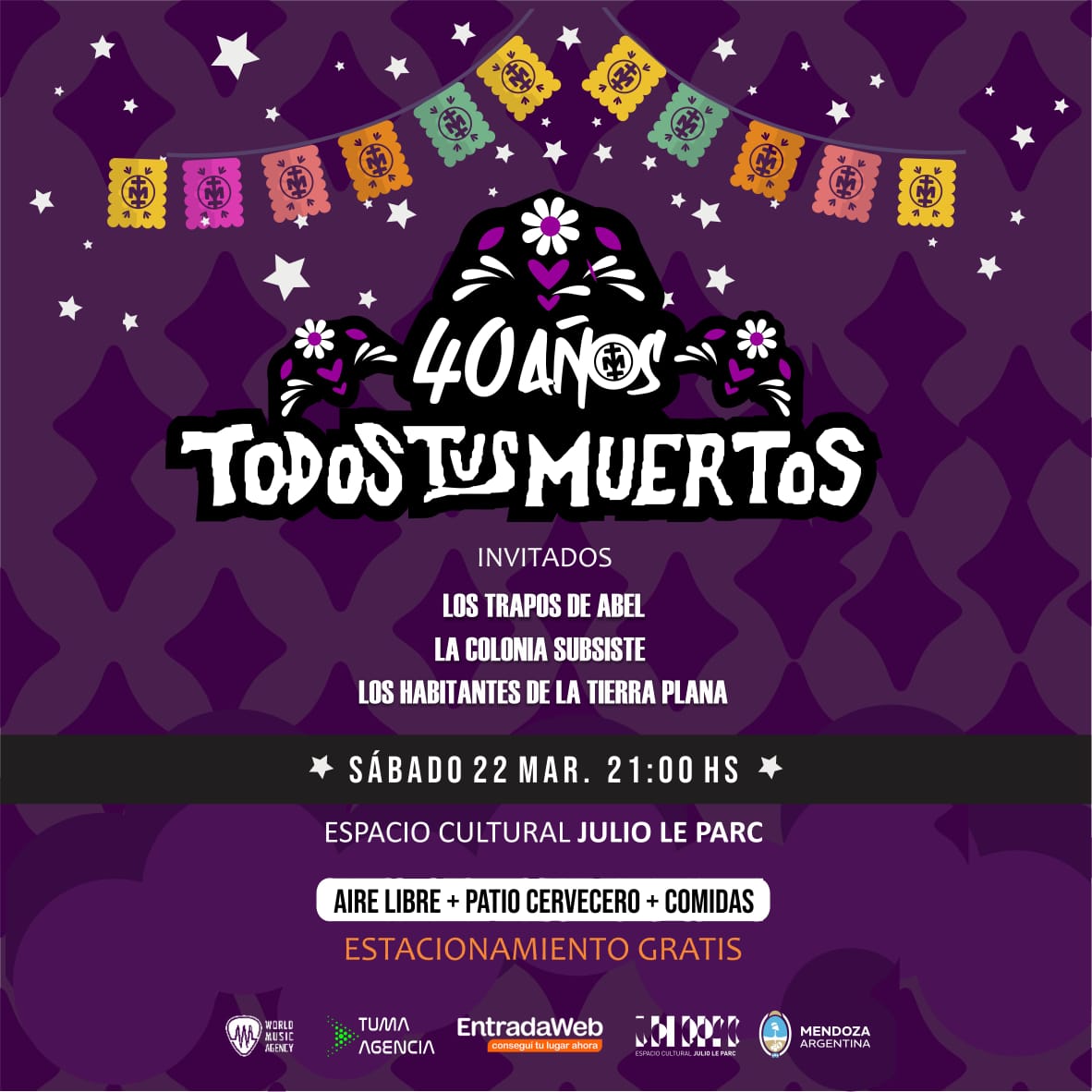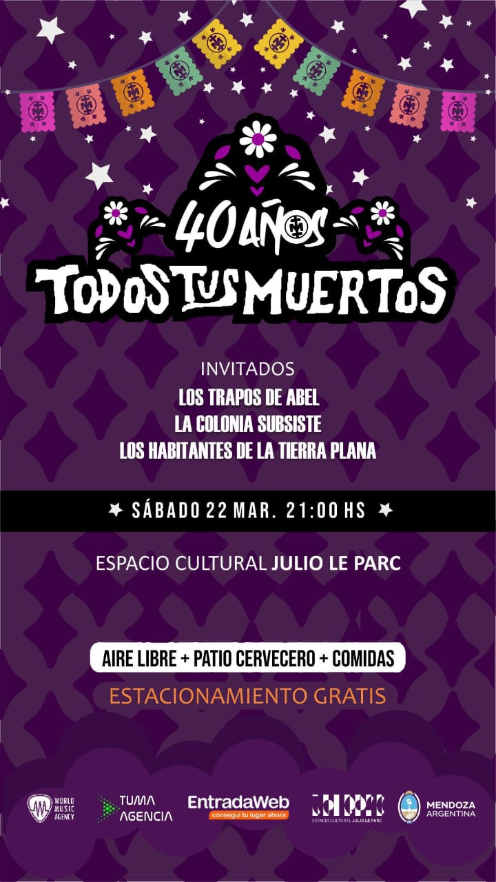 Todos Tus Muertos (@todostusmuertos_ig), la banda pionera en fusionar ritmos como el punk, rock y reggae, que marcó un antes y un después en la escena del rock latino, regresa a Mendoza para festejar sus 40 años de música. Encabezada por sus fundadores Fidel Nadal y el bajista Félix Gutiérrez, el sábado 22 de marzo a las 21h, la icónica agrupación desembarca en el Espacio Cultural Julio Le Parc (Mitre s/n y G. Cruz, Gllen.) para repasar todos sus clásicos.