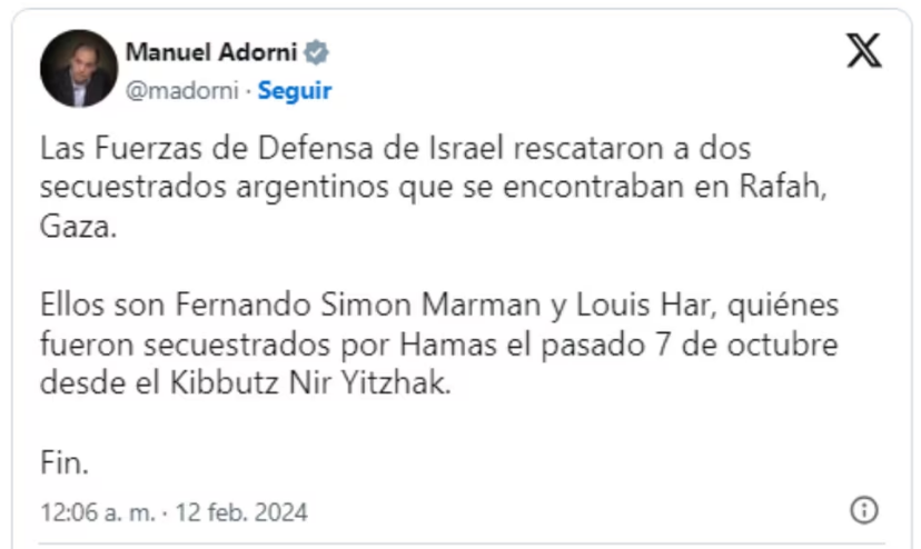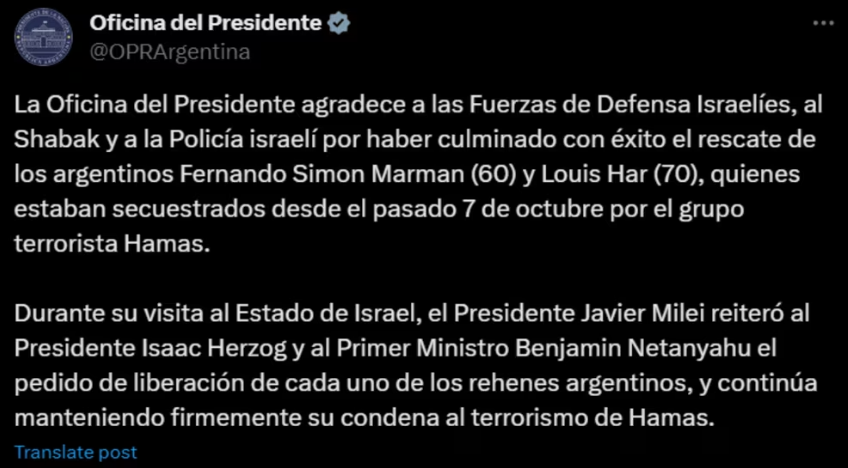 El Gobierno argentino confirmó también la información a través de la cuenta de X de la Oficina del Presidente Javier Milei, donde agradeció a las fuerzas de seguridad israelíes «por haber culminado con éxito el rescate de los argentinos».