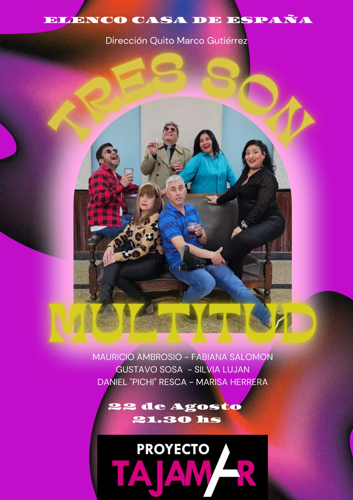 Tras presentarse el último fin de semana en el Cine Colón de San Martín desde el este llega «Tres son multitud» del elenco Casa de España para una función muy especial en Proyecto Tajamar (proyectotajamar) -Av. San Martín 1921, Paseo Alameda, Mendoza-.