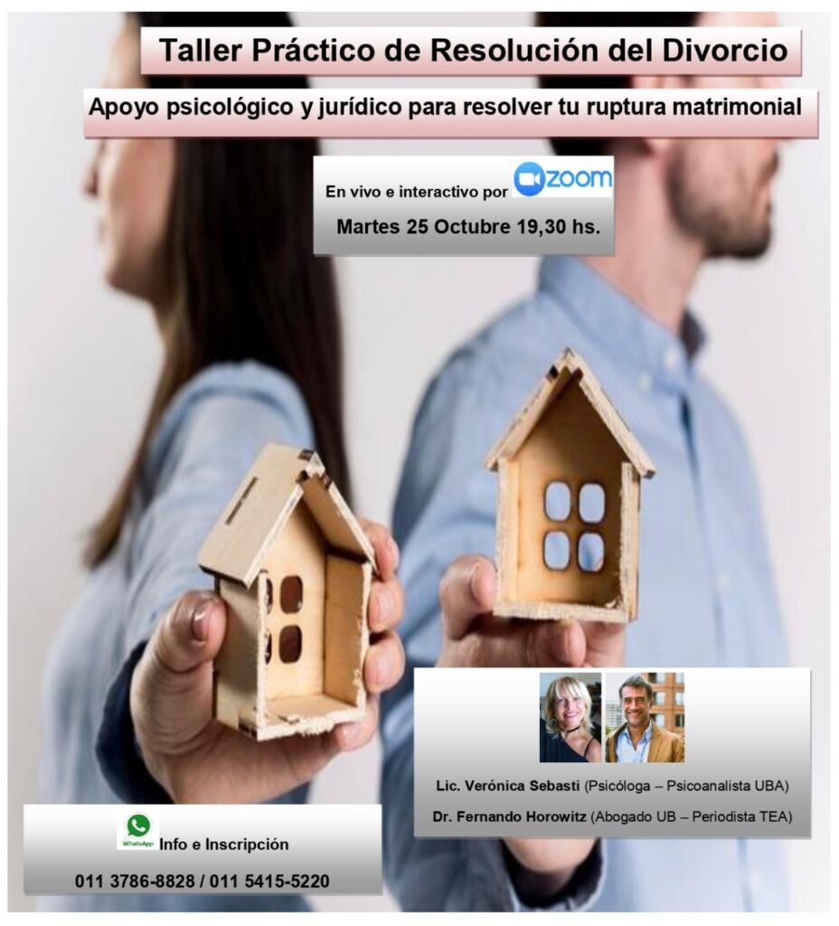 La disolución de pareja causa angustia y depresión. También genera conflictos legales por alimentos, distribución de bienes y manutención de hijos. El Taller Práctico de Resolución del Divorcio se realizará el martes 25 de Octubre a las 19,30 horas en vivo online por la plataforma Zoom donde mujeres y hombres de toda la Argentina recibirán apoyo psicológico y jurídico para resolver su ruptura matrimonial.