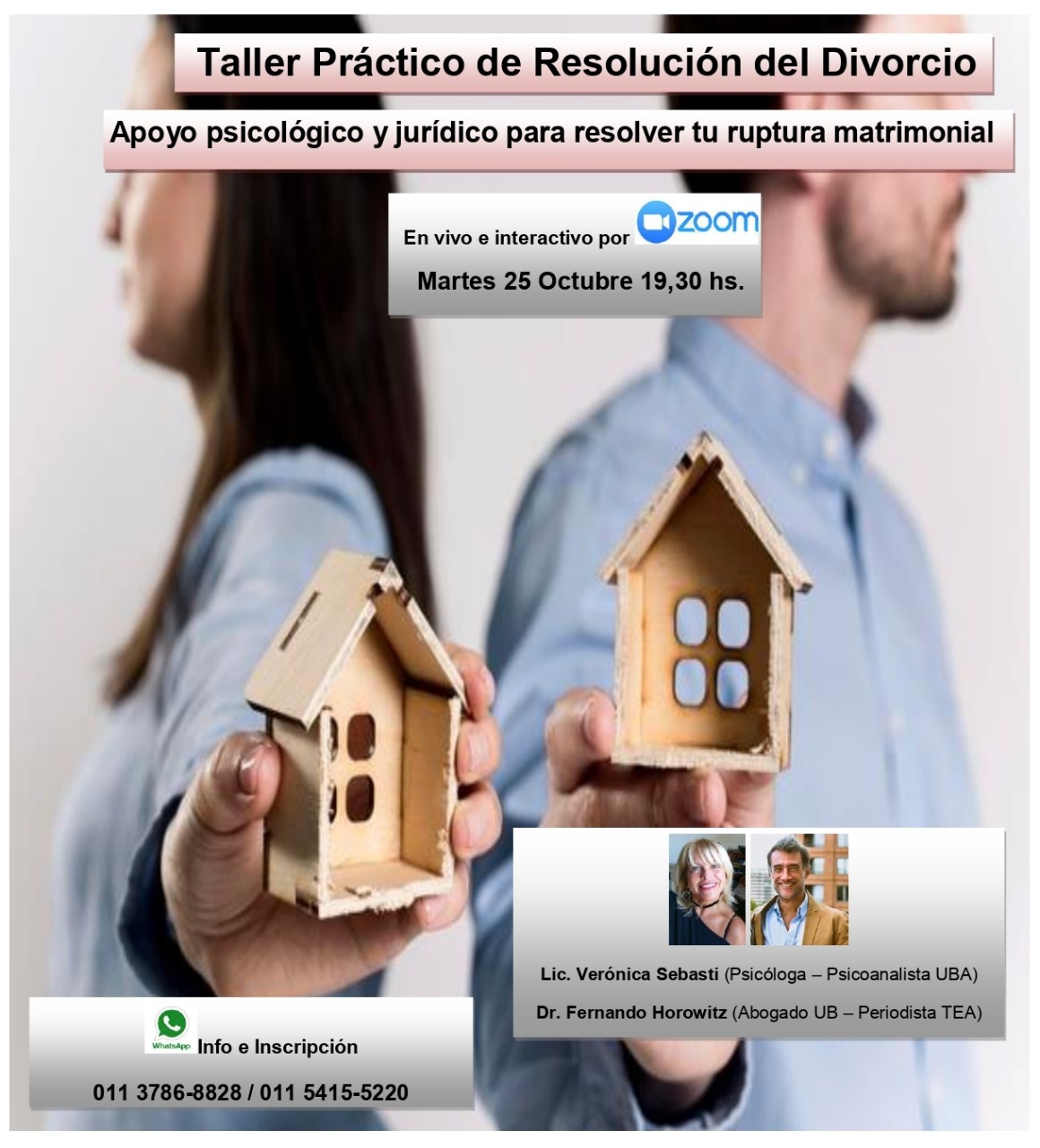 A cargo de la psicoanalista Verónica Sebasti y el abogado Fernando Horowitz, esta disertación profesional abordará problemáticas comunes a toda separación incluyendo interacción de los participantes para consultar dudas e inquietudes personales.