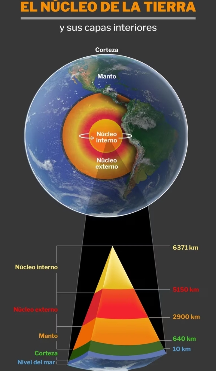 La Tierra está formada por diferentes capas que, en el centro, a 5.000 kilómetros de profundidad, tienen una esfera compúesta mayormente por hierro. Esto, en el ámbito de la ciencia, es conocido como el núcleo interno del planeta, con un radio de unos 1.220 kilómetros.