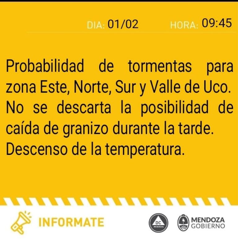 El comunicado de Defensa Civil expresa que se mantienen las condiciones de inestabilidad meteorológica con «probabilidad de tormentas para zona Este, Norte, Sur y Valle de Uco».