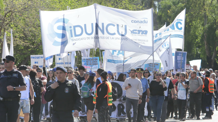 En las primeras columnas se pusieron al frente los docentes, alineados con el gremio Siduncu y Fadiunc, disputándole por momentos la cabeza de la manifestación a las autoridades de la UNCuyo.