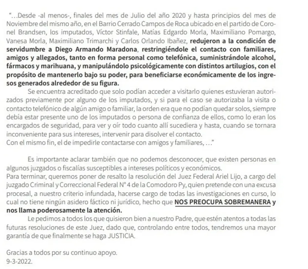 El escrito comienza de la siguiente manera: “Queremos poner en conocimiento de la opinión pública en general, y en especial de todos los que amaron a nuestro padre, Diego Armando Maradona, que ayer la Fiscalía N° 15 de la Ciudad de La Plata dio un paso más (como ya lo hicieron la Fiscalía General de San Isidro y el Juzgado Civil N°20 de la Ciudad de La Plata), en búsqueda de la verdad objetiva”.