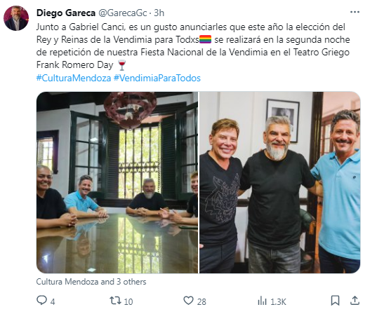 «Junto a Gabriel Canci, es un gusto anunciarles que este año la elección del Rey y Reinas de la Vendimia para Todxs se realizará en la segunda noche de repetición de nuestra Fiesta Nacional de la Vendimia en el Teatro Griego Frank Romero Day», publicó Diego Gareca, secretario de cultura de Mendoza.