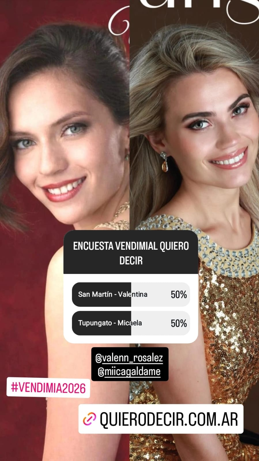 Son cinco candidatas y no cuatro porque hubo un empate muy cerrado hasta minutos antes de cerrar la encuesta entre Valentina Rosalez (valenn_rosalez) de San Martín y Micaela Galdame (miicagaldame) de Tupungato, ninguna de las dos merecía, ni podía quedar afuera, por eso las dos a semifinal junto a Agustina Giacomelli (agustinagiacomelli) de Tunuyán, que superó por amplia diferencia a la reina de Luján, Javiera Bravo (javvibravo)