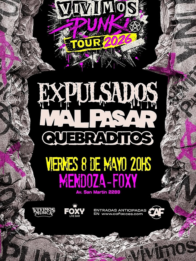 El Vivimos Punk Tour 2026 desembarca en Mendoza con una fecha que reúne a Expulsados, Mal Pasar y Quebraditos en un mismo escenario, por primera vez en la provincia. Será el viernes 8 de mayo a las 20 horas en Foxy Live Bar (Av. San Martín 2289, Ciudad).