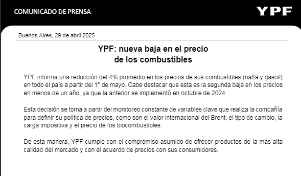 Desde YPF informaron que esta medida “responde al monitoreo permanente de variables como el Brent, el tipo de cambio, la carga impositiva y el precio de los biocombustibles”. A su vez, remarcaron que “la compañía sostiene su compromiso con la calidad y el cumplimiento de los acuerdos de precios vigentes”.